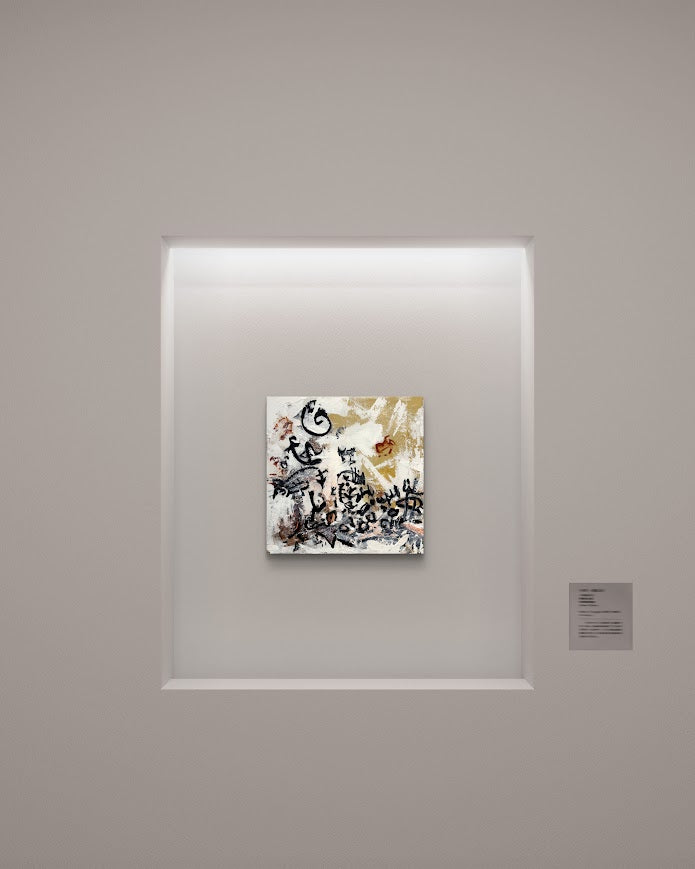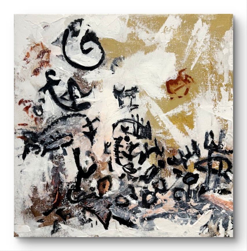 Broadway - A 12x12 inch acrylic painting on canvas that captures the urban energy and chaos of city life. This abstract composition features bold black calligraphic marks dancing across a neutral background of whites, grays, and warm golden tones, with hints of rust and brown adding depth and texture.