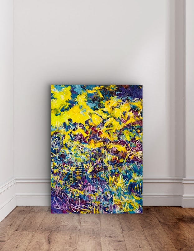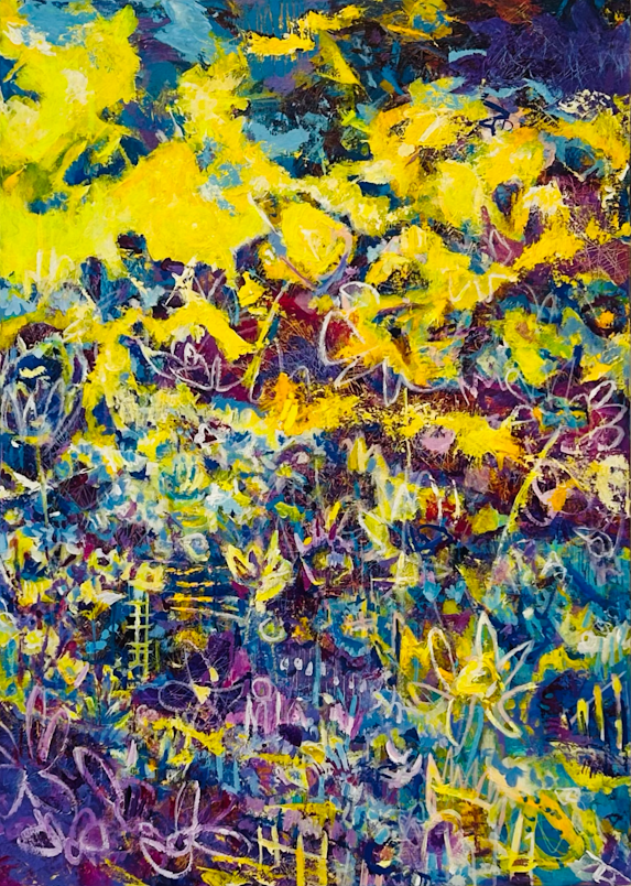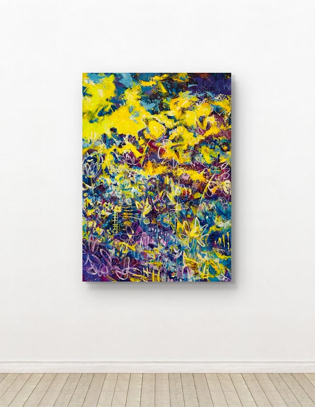 Grace - A 40x30 inch acrylic painting on canvas that captures the improvisational spirit of jazz through vibrant yellows radiating light, grounded by rich purples and blues. Like spontaneous jazz riffs, the gestural white lines dance across the canvas with rhythmic energy, creating movement and flow.