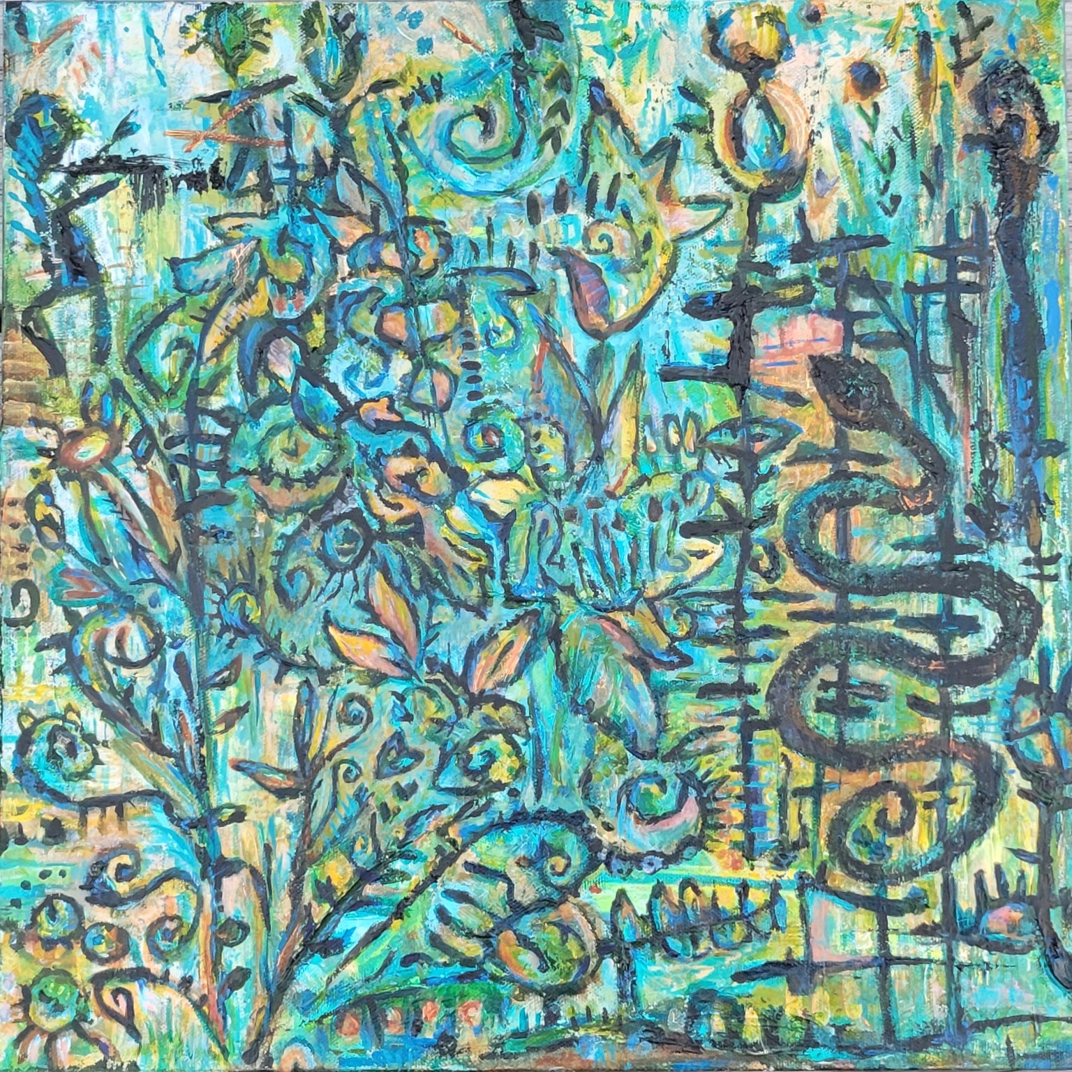 Lions Light - A vibrant and dynamic 16x16 inch acrylic painting that captures the essence of strength and illumination. This original artwork features a rich palette of blues, greens, and earth tones that create movement and energy across the canvas.