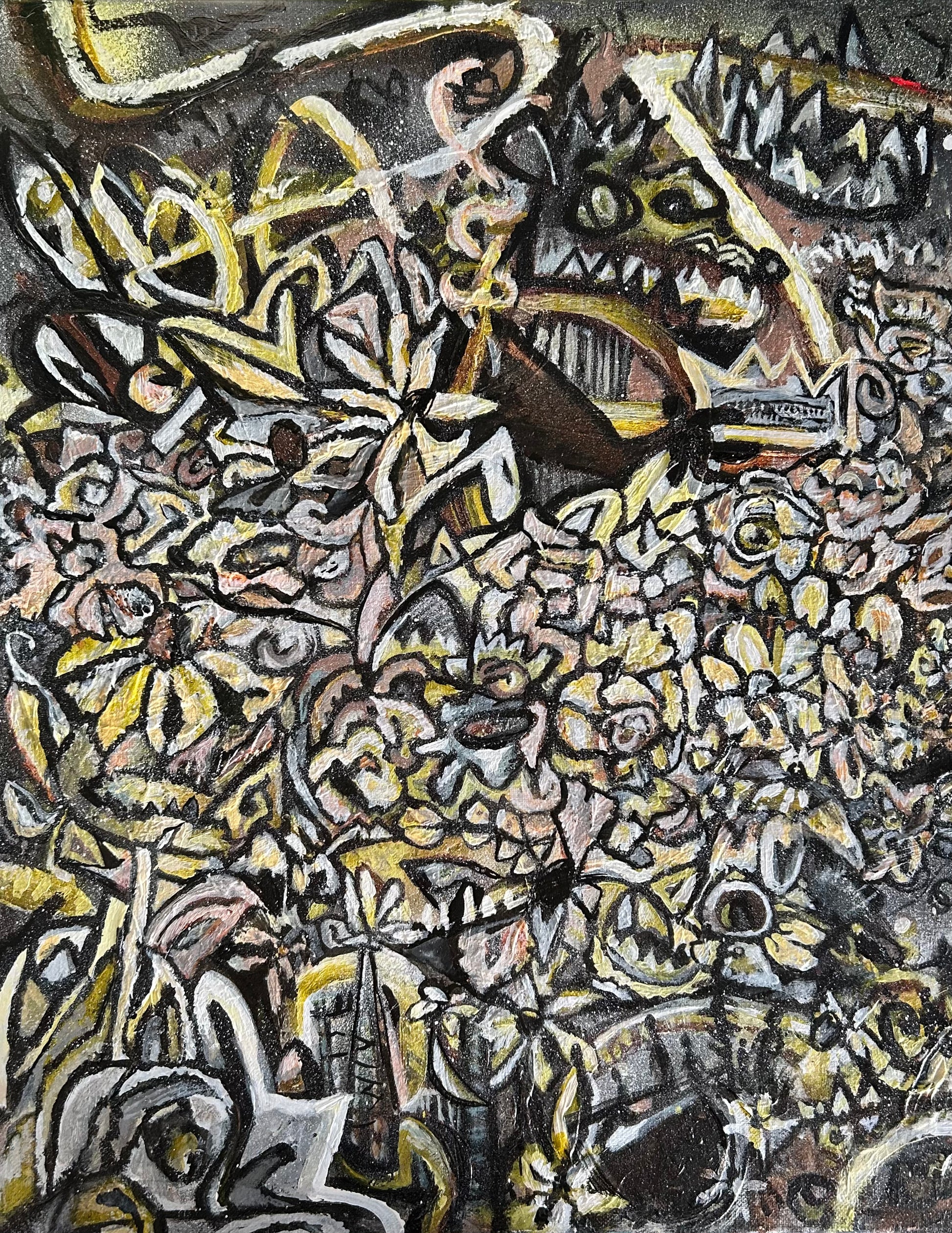 The painting pulses with life - every inch filled with detailed botanical elements that seem to grow and intertwine before your eyes.