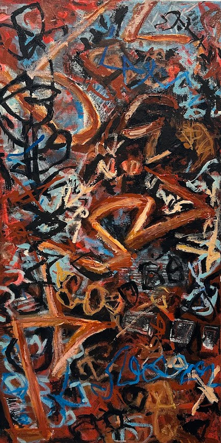 Zig Zag -This powerful 24x12 inch acrylic on canvas painting features an explosive composition of warm oranges, deep blues, and earthy browns that dance across the surface in rhythmic patterns. The artist's confident brushstrokes create a sense of controlled chaos, where geometric forms emerge and dissolve within layers of expressive mark-making.
